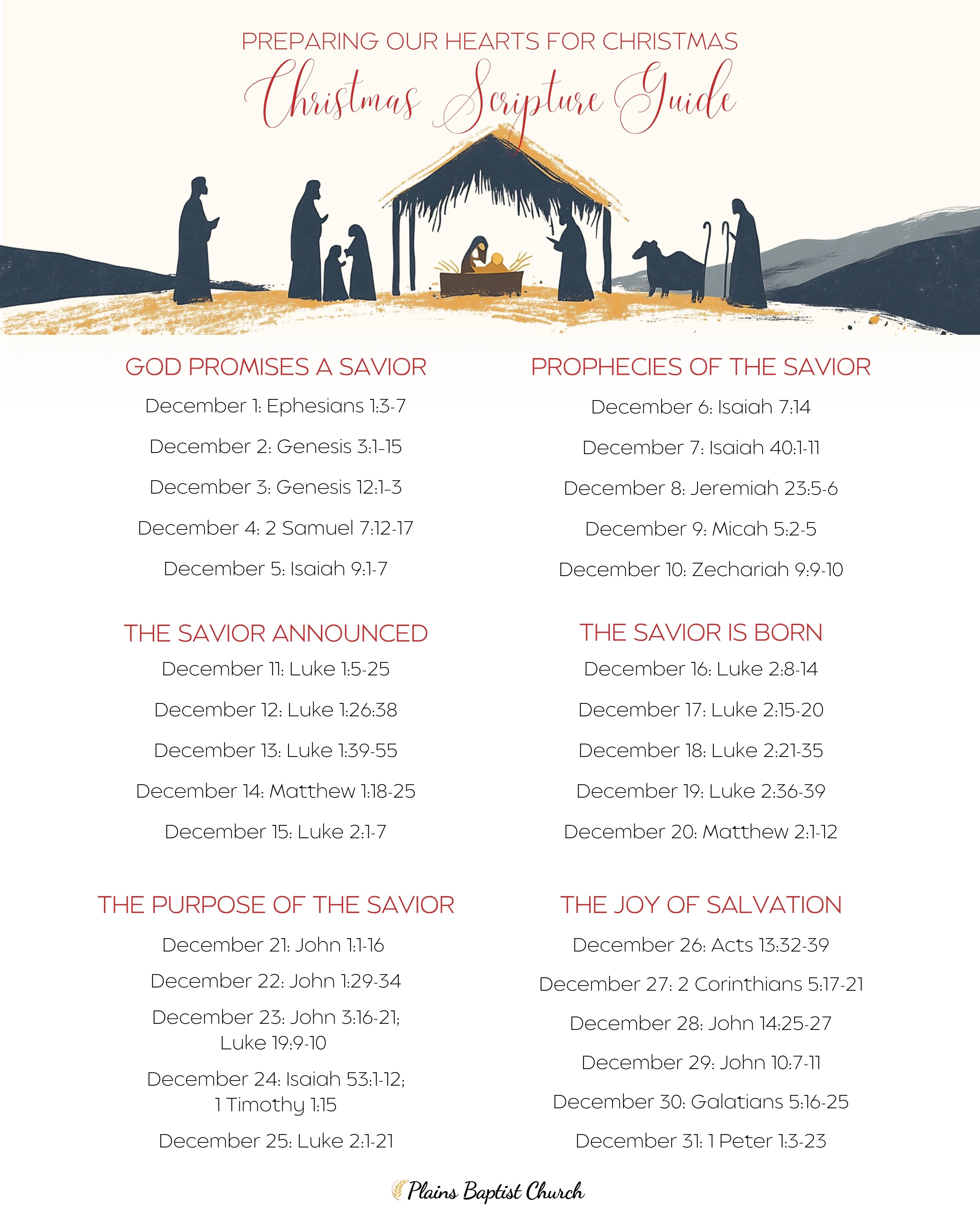 Download a PDF of the Christmas Scripture Guide and follow along with us as we prepare our hearts for the Savior who came to save the world.